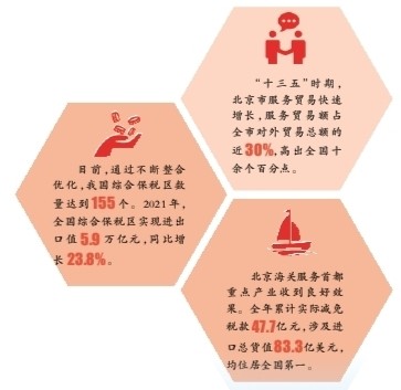 兩年多來,北京“兩區(qū)”建設(shè)成效突出、亮點紛呈。作為創(chuàng)新示范者,北京海關(guān)助力天竺綜保區(qū)加快打造具有服務(wù)貿(mào)易特色的綜合保稅區(qū),為北京開放發(fā)展先行先試前沿政策,為我國海關(guān)特殊監(jiān)管區(qū)域創(chuàng)新發(fā)展探索經(jīng)驗。2021年度,天竺綜保區(qū)進出口值、營業(yè)收入、屬地稅收分別同比增長37.6%、25.1%、22.1%,其中藥品藥械、文化藝術(shù)品進口規(guī)模分別占到全國總量的1/5、1/3。目前,園區(qū)形成了醫(yī)療健康、文化貿(mào)易、升級型消費、航空服務(wù)等重點產(chǎn)業(yè)。