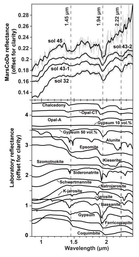 劉洋研究員和合作者通過對祝融號火星表面成分探測器獲取的短波紅外光譜和導航與地形相機數據進行分析,發現了一種形貌上類似沉積巖的巖石類型——板狀的亮色巖石。這些板狀巖石通常部分被灰塵和土壤覆蓋,顯示出剝落的表面,表明受到熱應力和風成作用的物理風化。研究人員利用短波紅外光譜在這些亮色板狀巖石中探測到了之前軌道數據在該區域沒有識別到的含水礦物,這些光譜具有~1.9μm和~2.2μm吸收特征,推測其為含水硅或含水硫酸鹽。