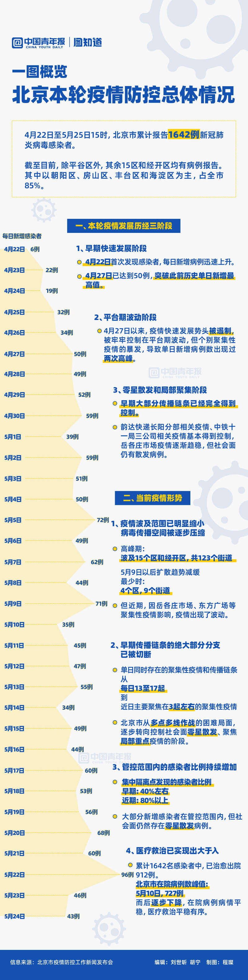 4月22日至5月25日15時,北京市累計報告1642例新冠肺炎病毒感染者,除平谷區外全市各區均出現了病例。超大城市迎戰奧密克戎,難之又難的以快制快之戰打得怎么樣、當前北京疫情形勢如何?一圖回顧。