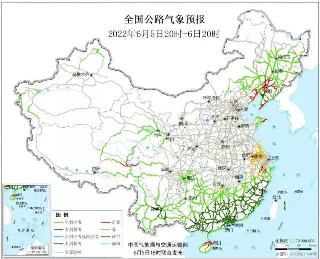 6月5日20時至6日20時,湖南南部、江西南部、浙江南部、福建大部、廣西南部和東部、廣東大部及云南中部、遼寧中部等地部分地區有大到暴雨,其中,湖南南部、廣西東北部、廣東西北部、福建西部等地部分地區有大暴雨。遼寧大部、山東東部、海南北部、西藏東北部等地局地有雷暴。另外,江蘇中南部、浙江中北部、安徽東部、湖南東部等地局地有霧。