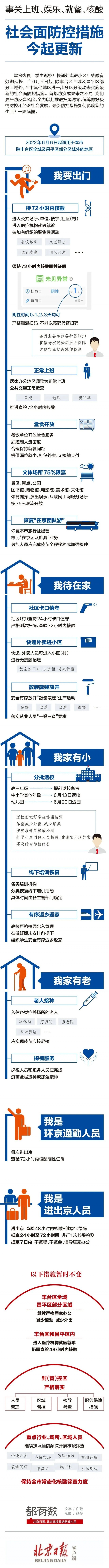 自6月6日起,除豐臺區全域及昌平區部分區域外,全市其他地區進一步分區分級動態實施最新的社會面防控措施。