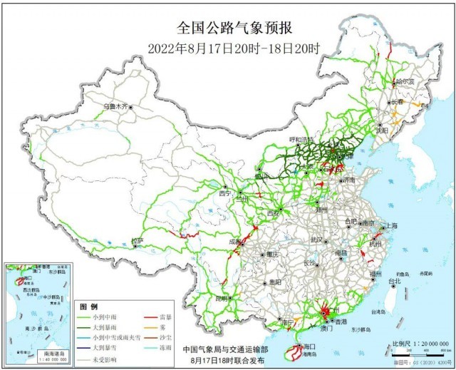 8月17日20時至18日20時,內蒙古中部偏南地區、遼寧西部、青海東部、甘肅中東部、寧夏、陜西北部、山西北部、河北中北部、北京、天津、廣東西南部等地部分地區有中到大雨,其中,內蒙古中部偏南地區、陜西北部、山西北部、河北東北部、北京北部、天津北部等地部分地區有暴雨,內蒙古中部偏南地區、山西北部等地部分地區有大暴雨。河北中南部、黑龍江西北部和南部、浙江西部和東北部、廣東中部、廣西東南部、海南島大部、四川中部、西藏東北部、寧夏南部等地局地有雷暴。另外,遼寧東部、吉林中東部、福建東部、廣西東南部、云南東北部等地局地有霧。受大到暴雨影響的主要路段有: