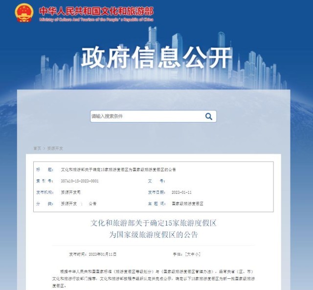 央視網消息:1月11日,文化和旅游部發(fā)布《關于確定15家旅游度假區(qū)為國家級旅游度假區(qū)的公告》。具體內容如下: