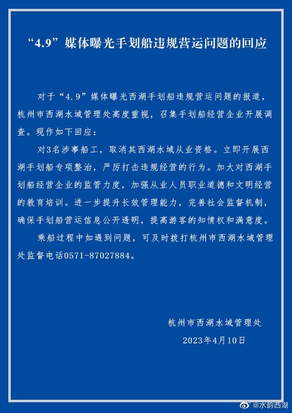 央視網消息:據@水韻西湖微博消息,對于“4·9”媒體曝光西湖手劃船違規營運問題的報道,杭州西湖水域管理處高度重視,召集手劃船經營企業開展調查。現作如下回應: