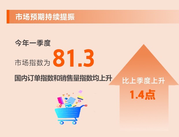 今年以來經濟循環加快暢通,市場需求逐步恢復,消費勢頭有所好轉,市場預期明顯恢復。一季度,市場指數為81.3,環比上升1.4點。所調查的8個行業中,國內訂單指數和銷售量指數均上升,7個行業銷售價格指數上升。