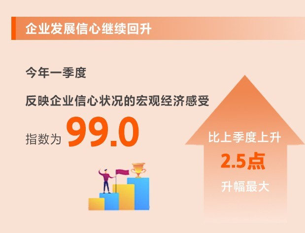 今年以來,我國經濟運行持續回暖,增長動能不斷釋放,發展信心明顯增強。一季度,反映企業信心狀況的宏觀經濟感受指數為99.0,比上季度上升2.5點,升幅最大。從宏觀經濟感受指數的細項看,宏觀感受指數為103.6,比上季度上升2.4點,高于景氣臨界值100;行業運行指數為94.3,比上季度上升2.6點,升幅較大。