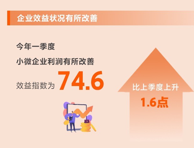 企業生產經營加速恢復,原材料價格漲幅收窄,以及延續優化減稅降費政策減輕企業負擔,小微企業利潤有所改善。一季度,效益指數為74.6,比上季度上升1.6點,反彈幅度較大,但仍處于歷史較低位。所調查的8個行業效益指數均有所上升。