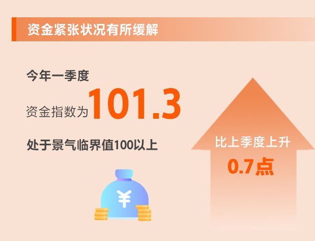 央行降準以及指導金融機構繼續支持小微企業,多措并舉“精準滴灌”,小微企業融資狀況不斷改善。一季度,資金指數為101.3,比上季度上升0.7點,處于景氣臨界值100以上。其中,流動資金指數為86.3,比上季度上升1.1點;融資指數為90.8,環比上升0.5點。所調查的8個行業中,8個行業流動資金指數、6個行業融資指數均上升。