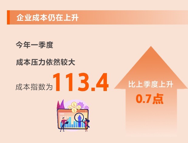 全球通脹仍處于高位,美聯儲急速加息對世界經濟影響的外溢效應持續顯現。中小企業多位于產業鏈下游且面對消費者,需求疲弱情況下難以轉嫁上游原材料價格上漲的壓力,同時還面臨人力成本上行以及房屋租金較高等困難。一季度,成本指數為113.4,比上季度上升0.7點,仍處于不景氣區間,說明成本壓力依然較大。所調查的8個行業中,7個行業生產成本指數、8個行業勞動力成本指數均上升。