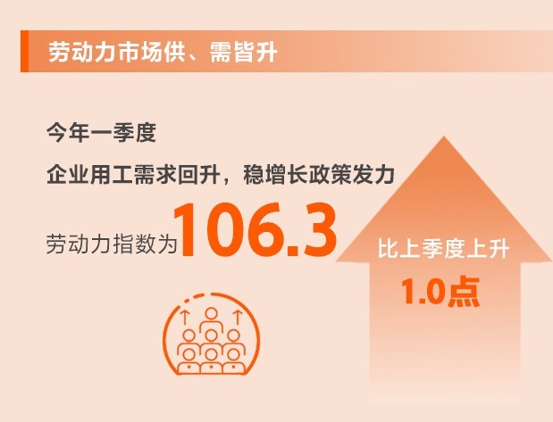 隨著生產生活秩序的恢復,人員流動性的提高,企業用工需求開始回升,同時穩增長政策持續發力,從業人數有所上升。一季度,勞動力指數為106.3,比上季度上升1.0點。其中,供應指數為113.6,比上季度上升0.1點;需求指數為98.9,比上季度上升1.9點。