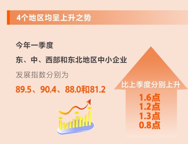 一季度,東、中、西部和東北地區中小企業發展指數分別為89.5、90.4、88.0和81.2,比上季度分別上升1.6、1.2、1.3和0.8點,東部地區指數上升幅度最大,中部地區指數最高,說明東部和中部地區經濟和中小微企業恢復較快。