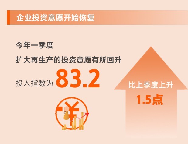 各地投向基礎領域、短板領域、科技創新領域的項目和計劃增多,企業對未來的信心有所增強,擴大再生產的投資意愿有所回升。一季度,投入指數為83.2,比上季度上升1.5點,所調查的8個行業投入指數均上升。