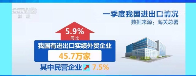 一季度,我國貨物進出口總額98877億元。其中,出口56484億元,同比增長8.4%,保持了較快增長,特別是我國對“一帶一路”沿線國家進出口增長16.8%,對RCEP其他成員國的進出口增長7.3%。同時,我國外貿競爭新優勢、增長新動能不斷培育壯大。一季度電動載人汽車、鋰電池、太陽能電池出口同比分別增長122.3%、94.3%和23.6%,合計增長66.9%,同比增量超過1000億元,拉高了出口整體增速2個百分點。此外,一季度,我國有進出口實績外貿企業45.7萬家,同比增長5.9%。其中,民營企業增加7.5%,外貿經營主體數量穩中有增,顯示外貿“熱度”穩步提升。