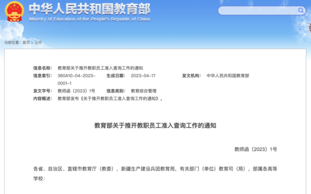 教育部教師工作司負責人指出,教育部從2008年起建立了教師資格限制庫,近年來不斷規(guī)范喪失、撤銷教師資格工作。考慮到喪失和撤銷教師資格覆蓋一部分違法犯罪信息,之前也出現(xiàn)過已喪失教師資格的人員又入職學(xué)校實施違法犯罪行為,造成惡劣影響。因此,此次查詢進一步拓展了查詢內(nèi)容,將教師資格限制庫的喪失、撤銷教師資格信息也納入擬聘用教師準入查詢范圍。旨在進一步加強師德師風建設(shè),對師德違規(guī)問題“零容忍”。
