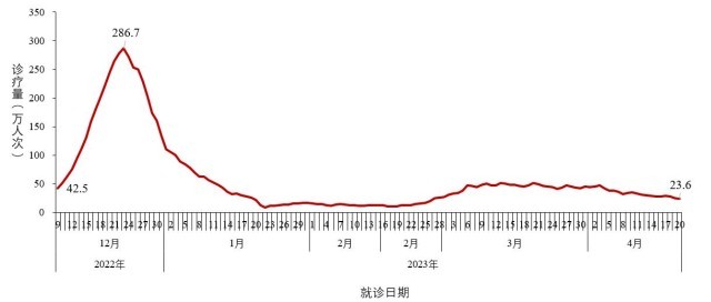 (三)城市發熱門診就診人數結果。全國二級以上醫療機構和城市社區衛生服務中心發熱門診(診室)就診人數于2022年12月22日達到峰值195.4萬人次,隨后連續下降;1月23日后呈低位波動,約6周(2月24日-4月6日)的波動增加及平臺波動后,近2周(4月7日-4月20日)呈下降趨勢,4月20日為16.8萬人次,較峰值下降了91.4%(圖2-3)。