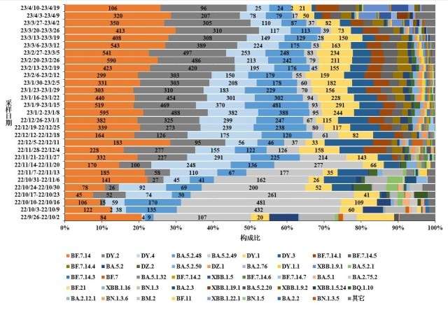 2.圖中標記的數字按順序分別為BF.7.14、DY.2、DY.4、BA.5.2.48、BA.5.2.49和DY.1進化分支有效基因組序列數量;