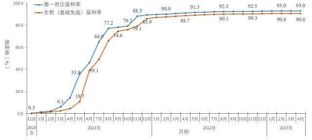 截至2023年4月20日,31個省(自治區、直轄市)和新疆生產建設兵團累計報告接種新冠病毒疫苗349443.2萬劑次(圖5-1)。接種總人數131048.0萬人,完成全程接種127708.4萬人,完成第一劑次加強免疫接種82783.9萬人。全人群第一劑次、全程接種覆蓋比例分別達到93.0%和90.6%(圖5-2)。60歲以上老年人累計報告接種新冠病毒疫苗68083.7萬劑次,接種總人數24169.3萬人,完成全程接種23036.1萬人,完成第一劑次加強免疫接種19318.9萬人。
