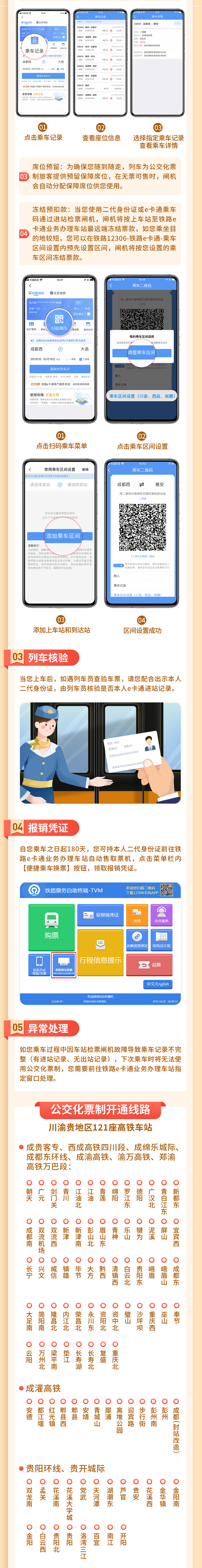 為進一步提升通勤旅客出行體驗,中國鐵路成都局集團有限公司管內的川渝貴地區121座高鐵車站啟用公交化票制。已開通鐵路e卡通的旅客在鐵路12306客戶端-鐵路e卡通主頁,啟用刷證模式,即可使用二代身份證或e卡通乘車碼,實現無需購票,刷證或掃碼即走。