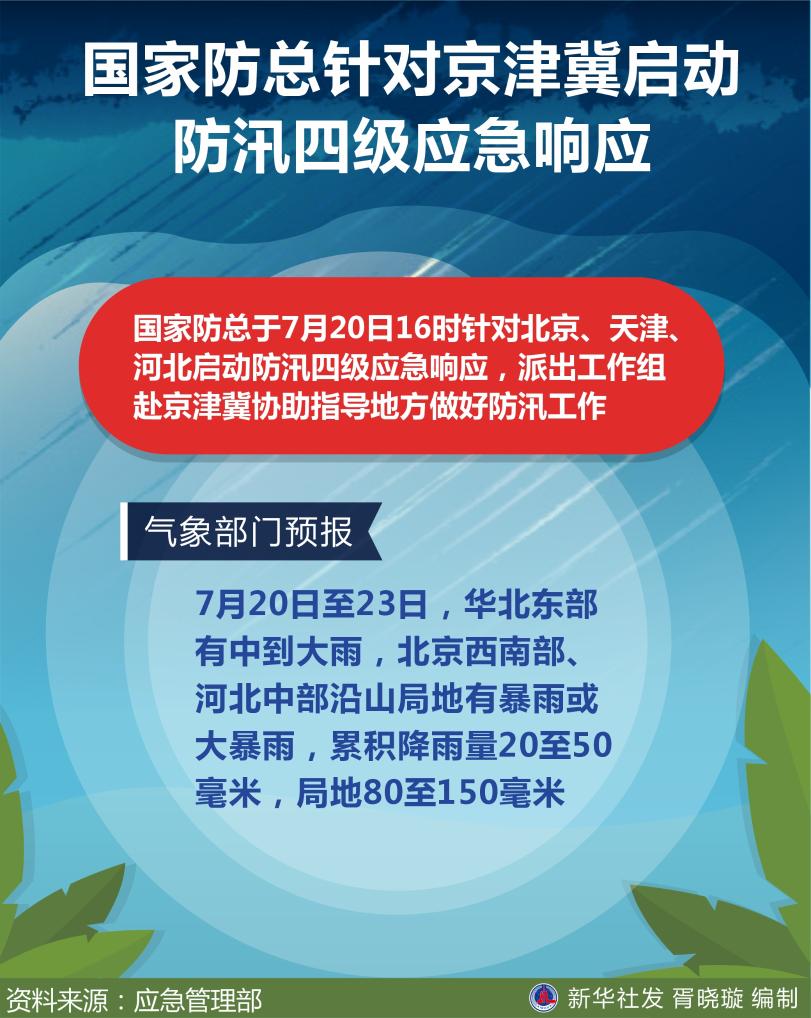 新華社北京7月20日電(記者周圓)記者20日從應急管理部獲悉,國家防總于當日16時針對北京、天津、河北啟動防汛四級應急響應,派出工作組赴京津冀協助指導地方做好防汛工作。