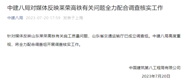 央視網(wǎng)消息:據(jù)“中建八局”公眾號消息,中國建筑第八工程局有限公司表示,針對媒體反映山東萊榮高鐵有關(guān)施工質(zhì)量問題,山東省交通運(yùn)輸廳已成立調(diào)查組。中建八局高度重視,將全力配合調(diào)查組開展調(diào)查核實工作。