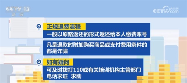 正規退費流程一般以原路返還的形式返還給本人繳費賬號,凡是退款時附加購買商品或支付費用條件的都是詐騙。如有疑問,可及時撥打110或有關培訓機構主管部門電話求證、求助。
