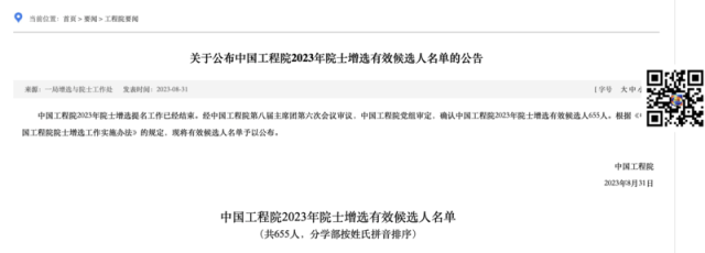 中國工程院2023年增選有效候選人655人,特別通道有效候選人34人