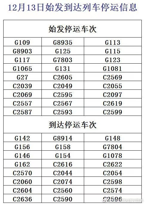 據北京西站官方微博今天中午最新消息,受降雪影響,12月13日,北京西站G57、G807、G97次列車臨時停運,北京豐臺站G63、G629次列車臨時停運。今天早上,北京西站、北京豐臺站已發布部分停運列車信息。已購買停運列車車票的旅客,可于30日內辦理全額退票手續。請廣大旅客合理安排出行,關注車站公告或12306網站信息。
