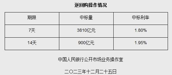 中新網12月25日電 據央行網站消息,為維護年末流動性合理充裕,2023年12月25日人民銀行以利率招標方式開展了4710億元7天期和14天期逆回購操作。具體情況如下: