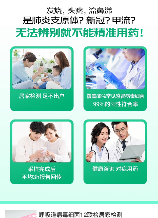 “99.99%陽性符合率,靈敏度比抗原高100到1000倍”……前不久,同樣發燒的王女士聽朋友推薦了一種可以上門做的呼吸道病毒細菌核酸檢測,“說是一次能查12種,比醫院的都全,價錢也不貴,首單69.9元。”