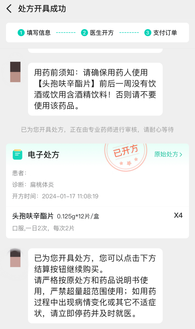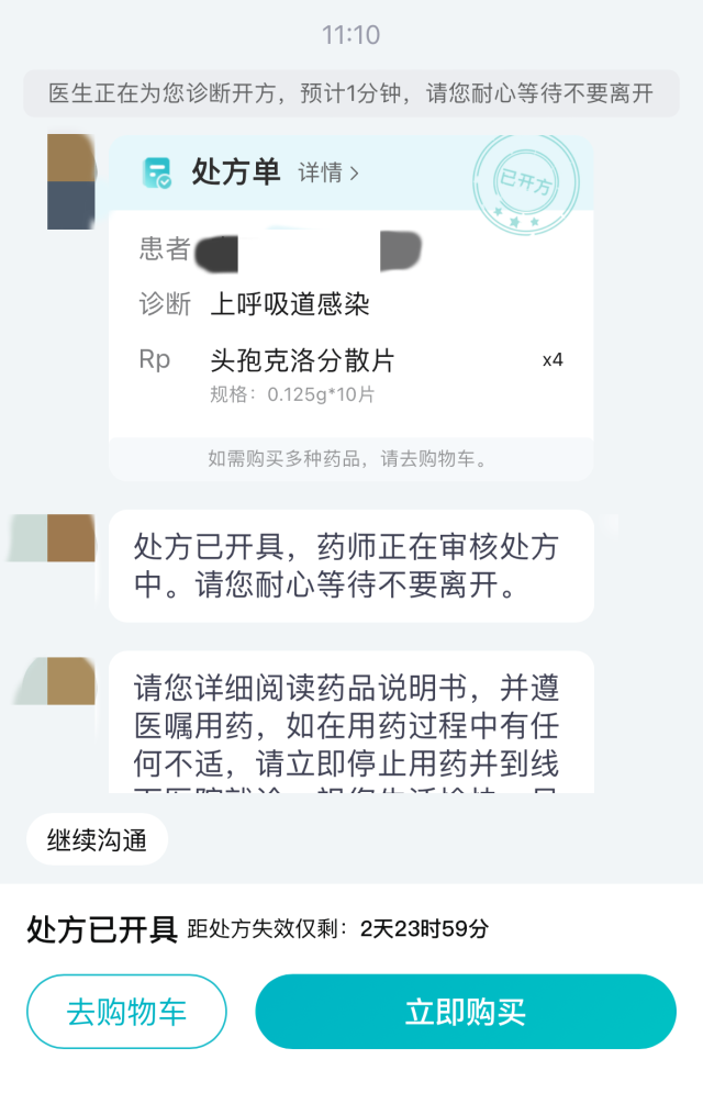 “您好,我是醫生XX,已收到您的復診開藥訴求,正在為您診斷開方,預計1分鐘,請不要離開……”自動發來三條問話后,記者并未回復任何信息,一份電子處方就順利開出。只需完成支付,處方藥就可以送貨上門。