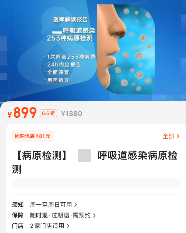 事實上,這并非種類最多的檢測方案。記者在調查中發現,有機構推出的呼吸道感染病原檢測一次篩查病原多達253種,原價1380元,折后也要899元。