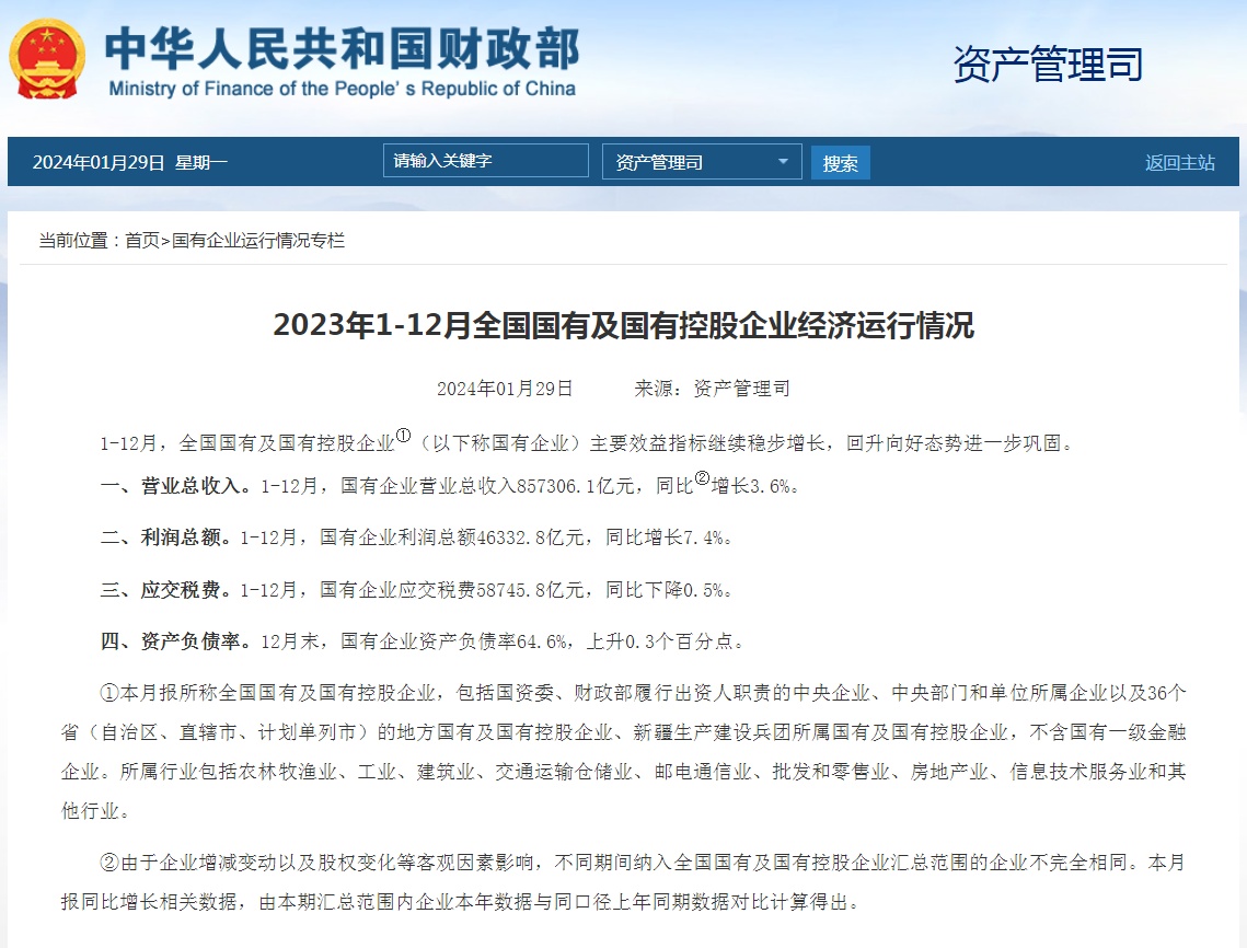 1月29日,財政部在其官方網站公布2023年1-12月全國國有及國有控股企業(yè)經濟運行情況。