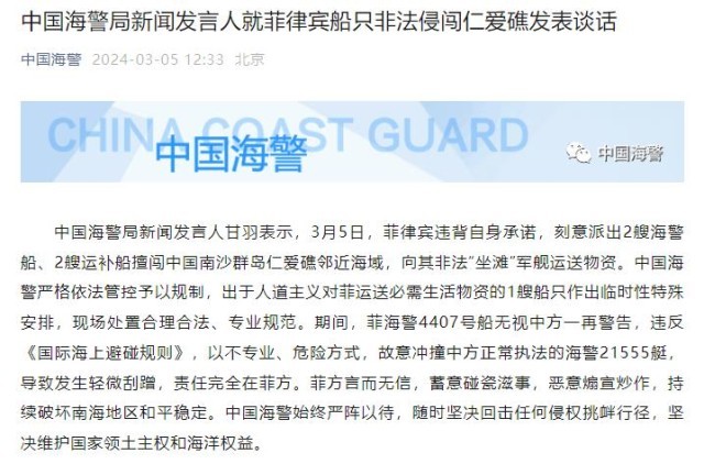 中國海警局新聞發言人就菲律賓船只非法侵闖仁愛礁發表談話