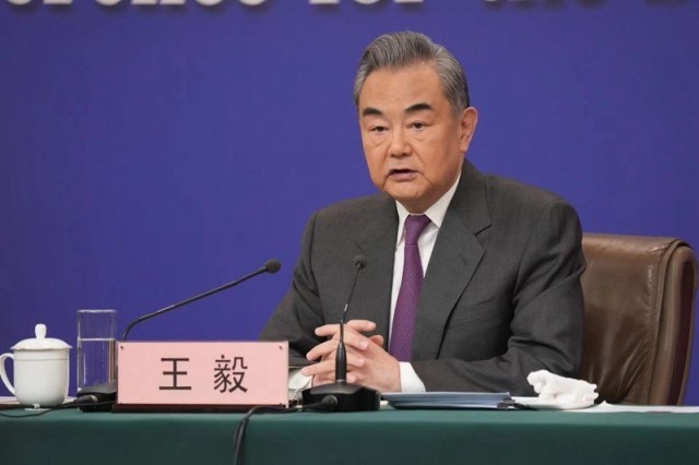 3月7日上午,十四屆全國人大二次會議舉行記者會,中共中央政治局委員、外交部部長王毅回應南海問題。中青報·中青網記者 李雋輝/攝