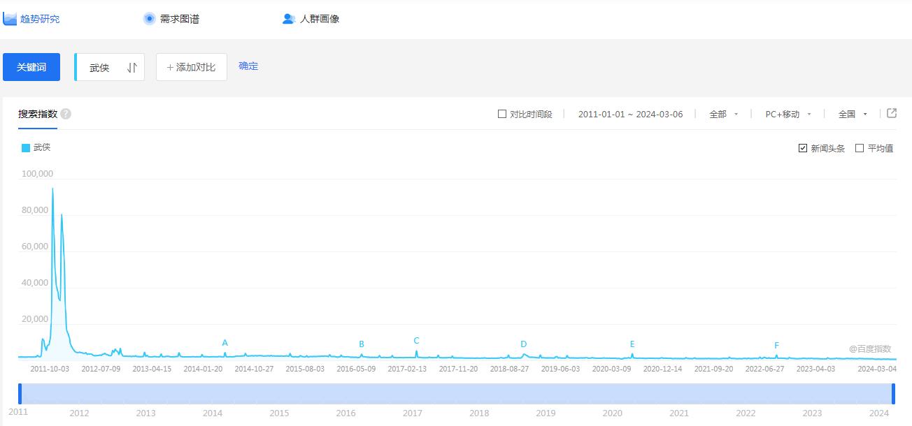 花開花落,少年子弟江湖老。幾十載春秋過去,如今的武俠小說陷入尷尬境地,令人唏噓。據百度指數,“武俠”在2011年憑借甄子丹、金城武主演的同名電影迎來最后的熱度巔峰后,一路“躺平”。