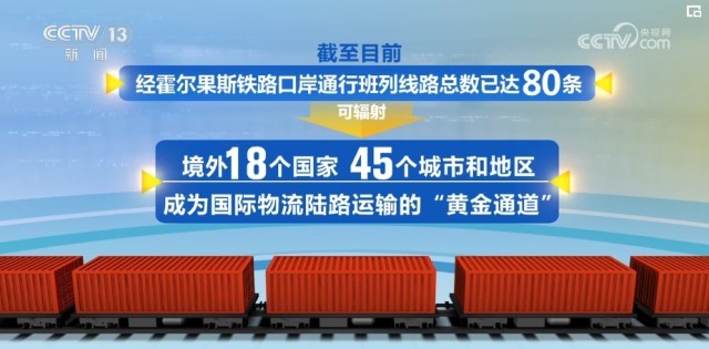 自2016年開出首趟中歐班列以來,經霍爾果斯海關監管的中歐(中亞)班列總量已超過3.5萬列。截至目前,經霍爾果斯鐵路口岸通行班列線路總數已達80條,可輻射境外18個國家、45個城市和地區,成為國際物流陸路運輸的“黃金通道”。