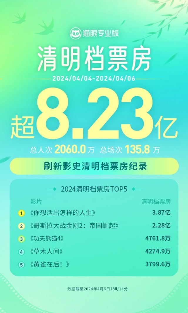 央視網消息:據貓眼專業版數據,截至4月6日18時14分,2024年清明檔(4月4日—4月6日)總票房突破8.23億,超2021年清明檔票房成績,刷新中國影史清明檔票房紀錄。