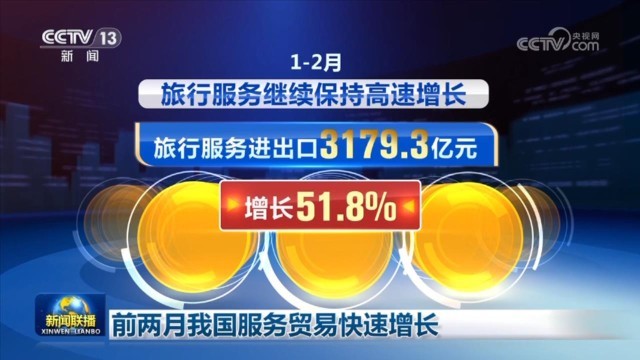旅行服務增長勢頭迅猛。1—2月,旅行服務繼續保持高速增長,旅行服務進出口3179.3億元,增長51.8%,成為服務貿易第一大領域。