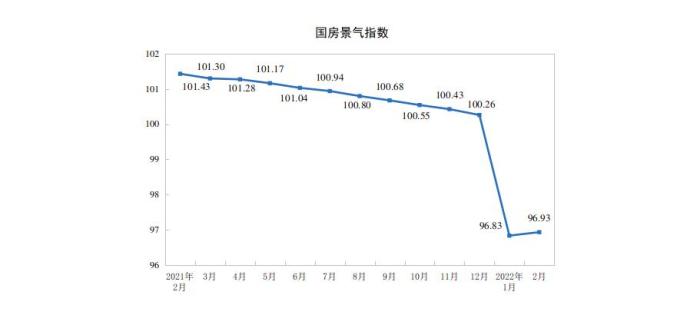 2月份,房地產開發景氣指數(簡稱“國房景氣指數”)為96.93。