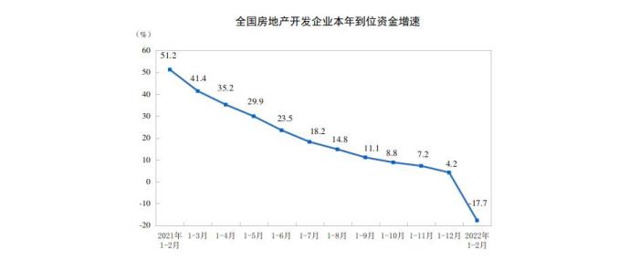 1—2月份,房地產開發企業到位資金25143億元,同比下降17.7%。其中,國內貸款4105億元,同比下降21.1%;利用外資7億元,下降27.4%;自籌資金7757億元,下降6.2%;定金及預收款8027億元,下降27.0%;個人按揭貸款4124億元,下降16.9%。