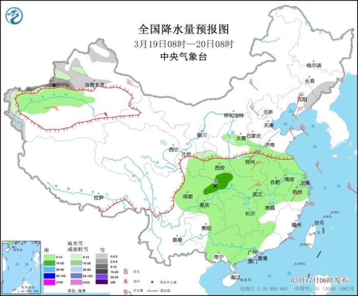 3月17日8時至18日8時,新疆北疆西部和沿天山一帶、青海北部、內蒙古中西部、山西中北部、河北大部、北京、天津、遼寧西部等地部分地區有小到中雪或雨夾雪,其中,內蒙古中部偏南地區、山西北部、河北西北部和北京西北部山區等地部分地區有大雪,局地暴雪(10~15毫米)。陜西中北部、河南中部、山東南部、江淮、江南大部、華南大部、西南地區東南部、臺灣島等地部分地區有小到中雨,其中,江蘇中南部、安徽東南部、上海等地部分地區有大雨,局地有暴雨(50~60毫米),上述部分地區伴有短時強降水(最大小時降雨量20~40毫米)。內蒙古中西部、青海東部、黃淮、江淮、江南北部河等地部分地區有4~6級風。渤海、黃海、東海等地部分海域有6~8級風。