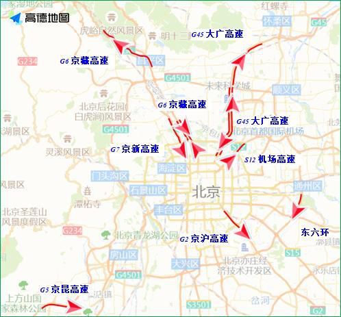 4日、5日12至20時,進京方向的交通壓力將明顯上升,其中京藏高速八達嶺、居庸關、西三旗、北沙灘,京承高速黃港、太陽宮,京港澳高速西道口、琉璃河,京開高速榆垡、玉泉營等路段車流較為集中。