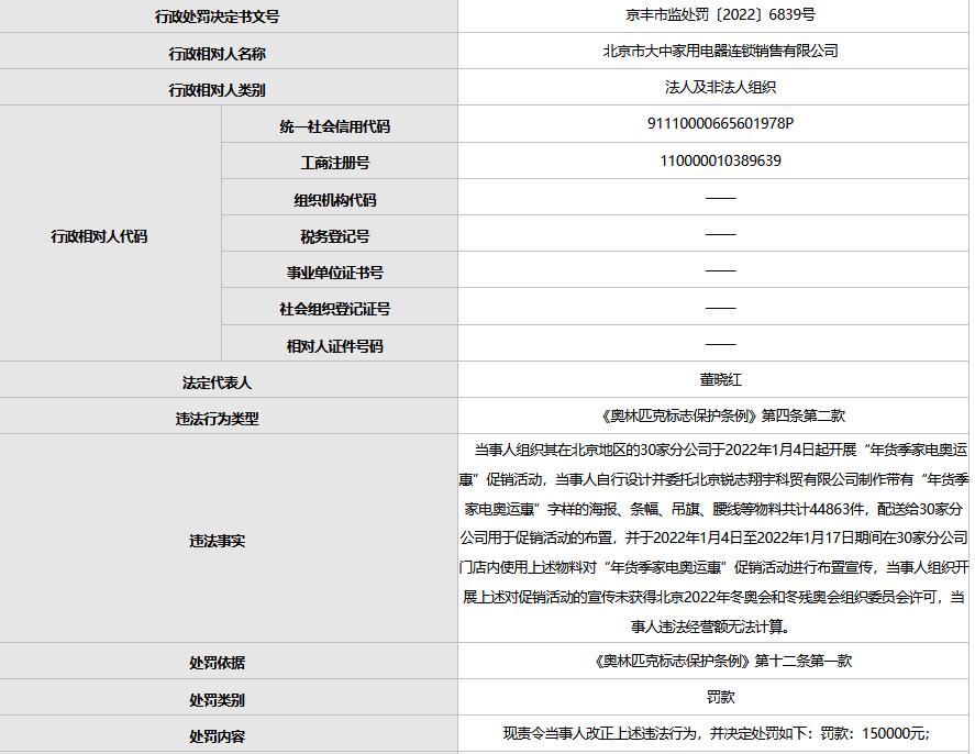 行政處罰書顯示,當事人自行設計并委托北京銳志翔宇科貿有限公司制作帶有“年貨季家電奧運惠”字樣的海報、條幅、吊旗、腰線等物料共計44863件,配送給30家分公司用于促銷活動的布置,并于2022年1月4日至2022年1月17日期間在30家分公司門店內使用上述物料對“年貨季家電奧運惠”促銷活動進行布置宣傳,當事人組織開展上述對促銷活動的宣傳未獲得北京2022年冬奧會和冬殘奧會組織委員會許可,當事人違法經營額無法計算。(完)