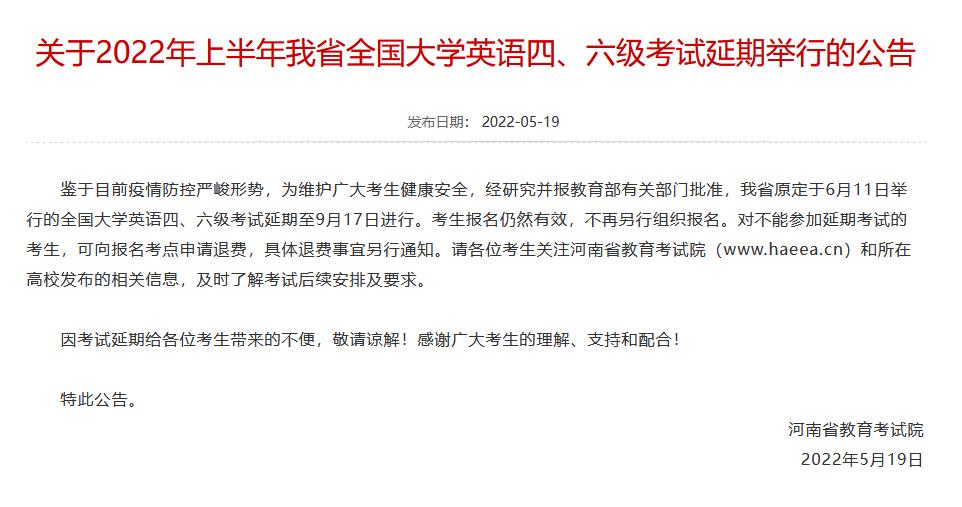 中新網5月19日電 據河南省教育考試院網站消息,鑒于目前疫情防控嚴峻形勢,為維護廣大考生健康安全,經研究并報教育部有關部門批準,河南省原定于6月11日舉行的全國大學英語四、六級考試延期至9月17日進行。考生報名仍然有效,不再另行組織報名。對不能參加延期考試的考生,可向報名考點申請退費,具體退費事宜另行通知。