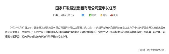 中新財經6月17日電 國家開發投資集團有限公司網站6月17日消息,2022年6月17日上午,國家開發投資集團有限公司召開中層以上管理人員大會。中央組織部有關負責同志在會上宣布了中央關于國家開發投資集團有限公司董事長、黨組書記任職的決定:付剛峰同志任國家開發投資集團有限公司董事長、黨組書記,免去其中國遠洋海運集團有限公司董事、總經理、黨組副書記職務。相關職務任免按有關法律和章程的規定辦理。(完)