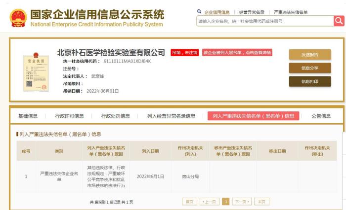 北京樸石醫學檢驗實驗室被列為嚴重違法失信企業