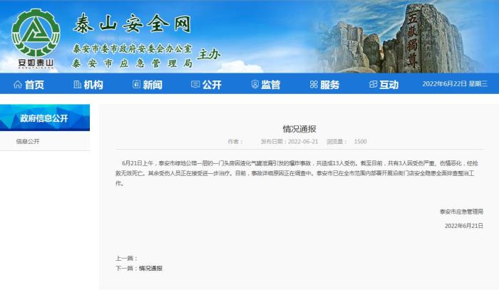 中新網6月22日電 據山東省泰安市應急管理局網站消息,山東泰安市應急管理局21日發布通報,6月21日上午,泰安市綠地公館一層的一門頭房因液化氣罐泄漏引發的爆炸事故,共造成13人受傷。截至目前,共有3人因受傷嚴重、傷情惡化,經搶救無效死亡。其余受傷人員正在接受進一步治療。