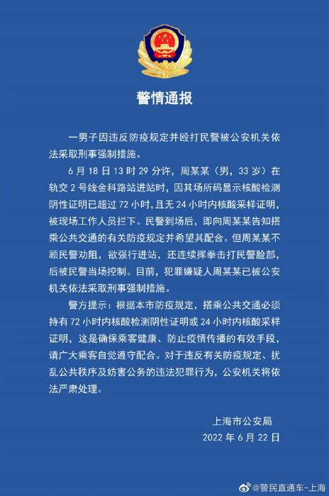 6月18日13時29分許,周某某(男,33歲)在軌交2號線金科路站進站時,因其場所碼顯示核酸檢測陰性證明已超過72小時,且無24小時內核酸采樣證明,被現場工作人員攔下。民警到場后,即向周某某告知搭乘公共交通的有關防疫規定并希望其配合。但周某某不顧民警勸阻,欲強行進站,還連續揮拳擊打民警臉部,后被民警當場控制。目前,犯罪嫌疑人周某某已被公安機關依法采取刑事強制措施。
