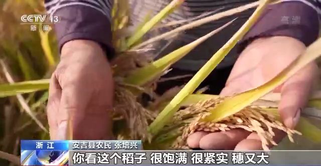 浙江省安吉縣農民 張培興:你看這個稻子,很飽滿、緊實,穗又大,稻子千粒重也比往年要重。已經到達我的預期了,我很開心。