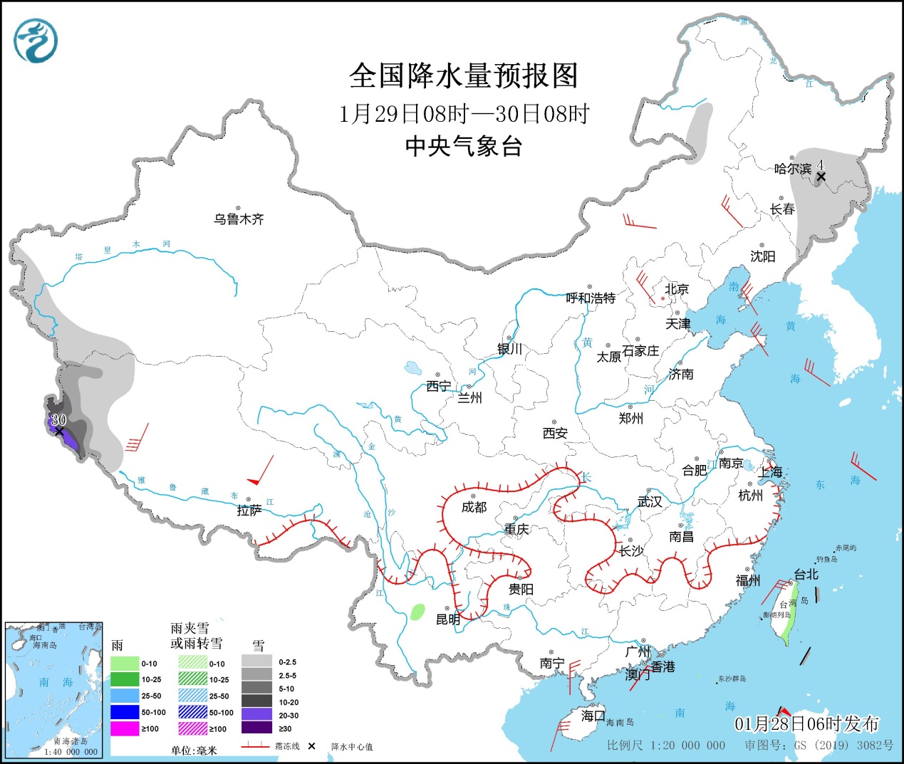 全國降水量預報圖(1月28日08時-29日08時)。圖片來源:中央氣象臺網站